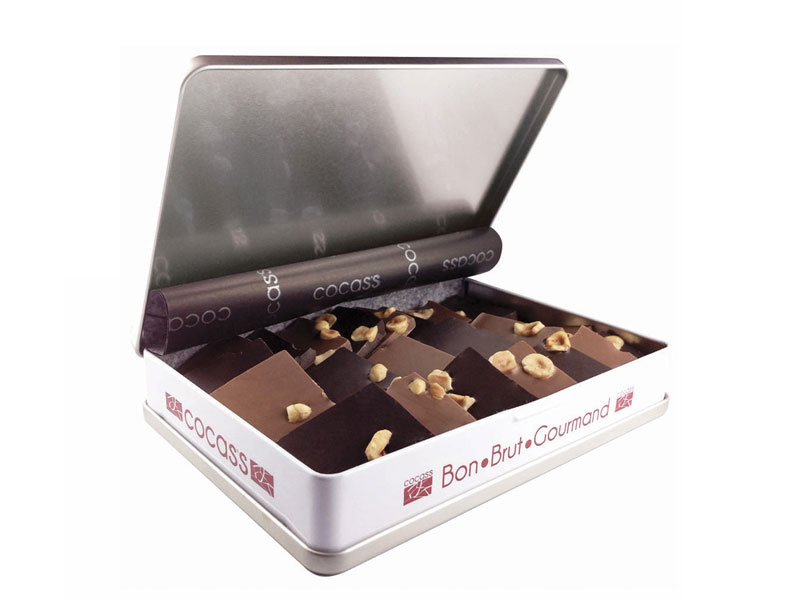 Coffret métal au design Maya de 400g, réunissant les deux chocolats Cocass : le chocolat noir supérieur 61% de cacao minimum et le chocolat au lait supérieur 33,9% de cacao minimum.